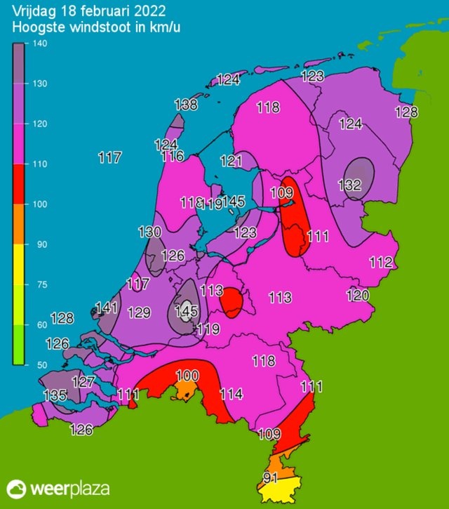 Op de bovenstaande weerstations de meest hallucinante windstoten. Alleen in Cabauw (18 februari 2022 tijdens storm Eunice: 145 km/u) en Herwijnen (26 februari 1990: 133 km/u) zijn er na deze storm nog zwaardere windstoten gemeten.