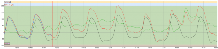 Zoals in afbeelding is te zien,is er vrijdag/zaterdag geen overlap tussen de zwarte (astronomisch) en groene (windopzet) lijnen.