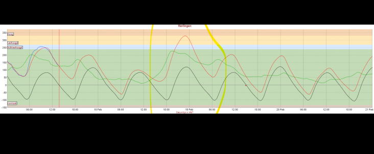 Hier zien we al een betere overlap op zaterdagochtend de 19e tussen de zwarte&groene lijnen,daardoor schiet de verwachting ook omhoog naar nu ongeveer +340cm NAP.