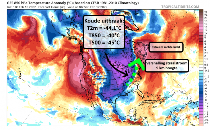 Op een bol zoals de aarde is alles met elkaar verbonden. De oorzaak van de versnelling (jet streak) in de straalstroom vinden we terug in een koude-uitbraak boven de VS op 11-13 februari. De straalstroom versnelt zodra de temperatuursverschillen tussen de polaire lucht in het noorden en de subtropische lucht in het zuiden sterker worden. Dit gebeurde in de VS. In het noorden en noordoosten daalde de temperatuur in 24 uur van circa 15,6°C naar -4°C. Op 850 hPa (1.5 km) daalde de temperatuur van +5°C naar -25°C in enkele dagen tijd. Voor de binnenkomst van koude lucht werden recordhoge temperaturen gemeten in het noordoosten van de VS.