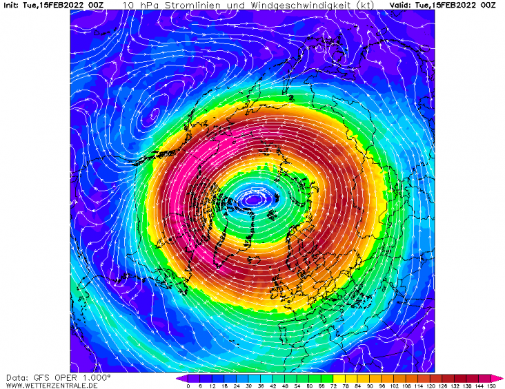 De stratosferische vortex is om door een ringetje te halen, deze vortex vinden we op 30 km hoogte (10 hPa).