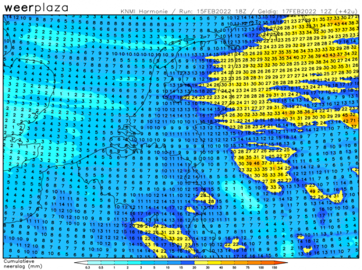 NB: Deze standen staan uiteraard nog lang niet vast voor de vrijdag/zaterdag,blijft afhankelijk van de verwachtte koers en windsnelheden,en over wat voor een oppervlak hij meeneemt van de Noordzee met name voor de noordelijke provincies hangt daar veel van af,dat kan zo een 20-40cm meer of minder worden.