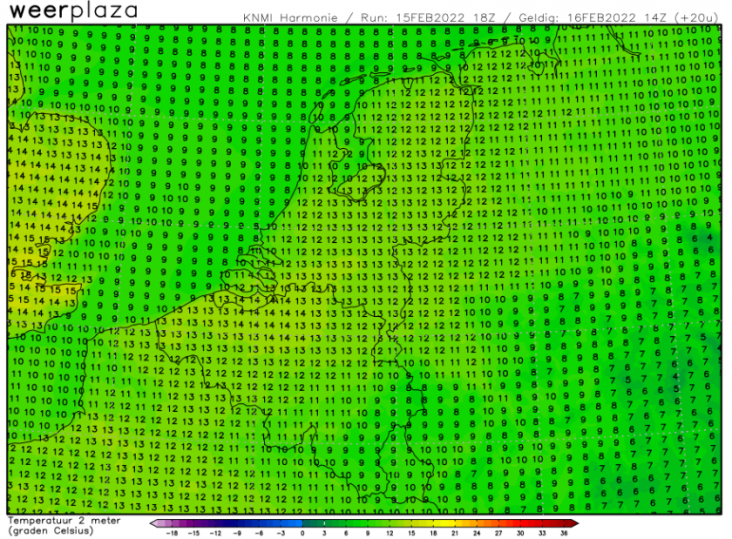 De extreem hoge temperaturen verdienen ook wat aandacht, de temperatuur stijgt - nadat woensdagochtend een warmtefront weer overtrekt - naar 11 tot 13°C.