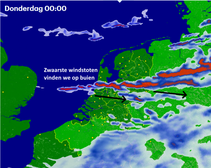 In het binnenland zijn windstoten tot 100 km/u echter ook mogelijk, en hier is dit vrij uitzonderlijk. De windstoten zijn gekoppeld aan pittige buien die boven het land ontstaan en naar het oosten trekken. De wind is hierbij erg variabel, er is lokaal 100 km/u mogelijk, maar het kan ook beperkt blijven tot 80 km/u, dit verschilt van plaats tot plaats. De buien ontwikkelen zich nog verder en pakken boven Duitsland nog verder uit met lokaal mogelijk 120 km/u. Mochten de buien al eerder op hun piek komen, dan zijn deze windstoten ook mogelijk aan de Duitse grens, zijn de buien traag in ontwikkeling, dan verplaatsen de windstoten zich nog meer naar Duitsland en komen we aan de lage kant uit (80 km/u).