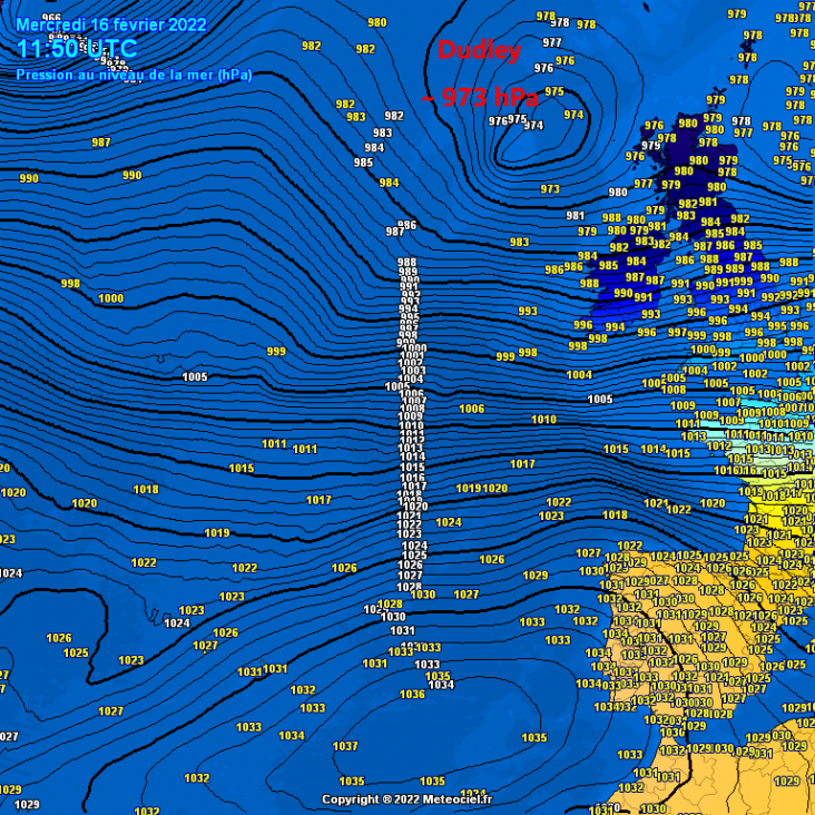 Dudley en Pre-Eunice (Eunice is nog niet ontstaan) liggen aan een atmosferische rivier. De atmosferische rivier zien we op dit satellietbeeld uit de hoek linksonder naar het noordoosten gaan. De afgelopen 24 uur is de luchtdruk al gedaald van 984 hPa naar 973 hPa. De komende uren zal de luchtdruk verder dalen naar circa 966 hPa.