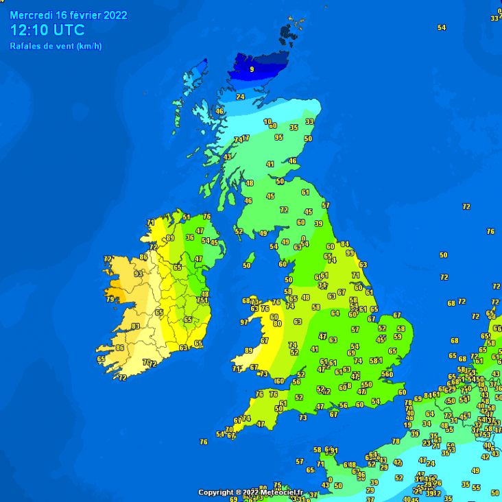 In Wales en Schotland al windstoten tot 160 km/u, maar die spelen "vals" met heuvels en bergtoppen. De Engelse oostkust meet ook al zo nu en dan 100 km/u windstoten. Deze snelheden gaan bij ons ook zeker voorkomen bij buien. Ik verwacht geen windstoten van meer dan 120 km/u zoals in Schotland en Wales.