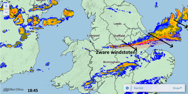We zagen de afgelopen avond al zware buien op de Britse regenradar. Het is ook geen toeval dat precies bij deze buien de zwaarste windstoten in Engeland voorkwamen (105 km/u).