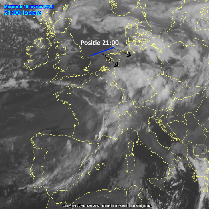 Een westelijke stroming voert maritiem polaire lucht aan. Vanmiddag wordt de stroming licht anticyclonaal en neemt deze verder in kracht af. Een occlusie schampt vanmiddag nog het noordoosten van de FIR. In de avond beweegt er een zwakke storing (combinatie van een flauwe trog en hogere theta-w waarden - van oorsprong een CAD) over de zuidelijke helft oostwaarts. In de nacht naar vrijdag passeert een ZO-NW georiënteerde rug. Vrijdag trekt stormdepressie Eunice via het noorden van Engeland naar de Noordzee om vervolgens in de avond boven het noorden van Denemarken te arriveren. Bijbehorend NW-ZO georiënteerd warmtefront trekt in de ochtend vlot oostwaarts over het land. In de middag volgt het N-Z georiënteerde koufront. De backbent-occlusie schampt in de middag en avond de noordkust.