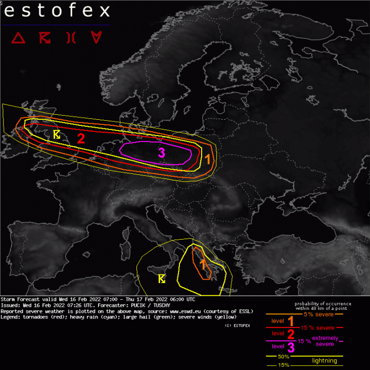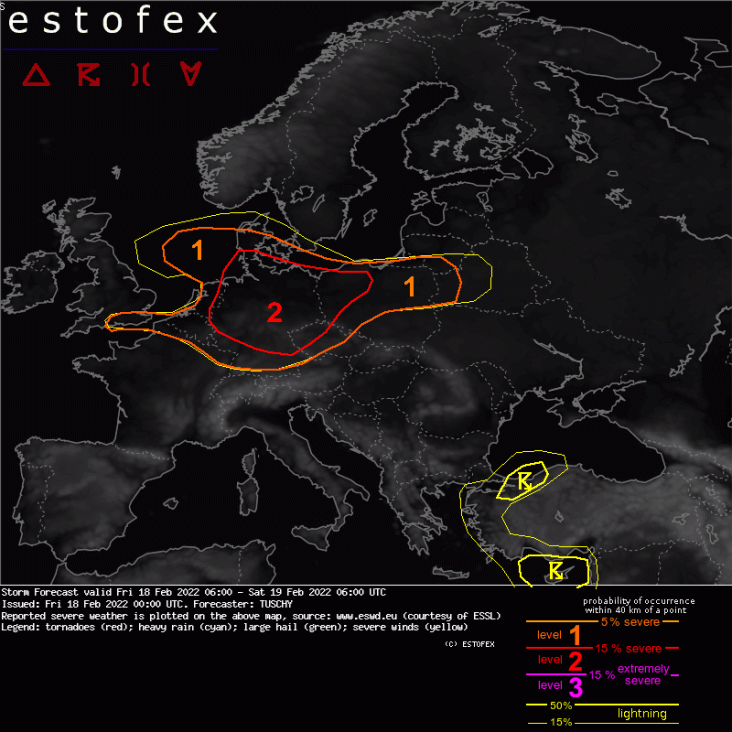 A level 2 was issued across parts of Benelux into Germany, Poland and Czechia mainly for severe to extremely severe wind gusts. A few tornado events are possible.
