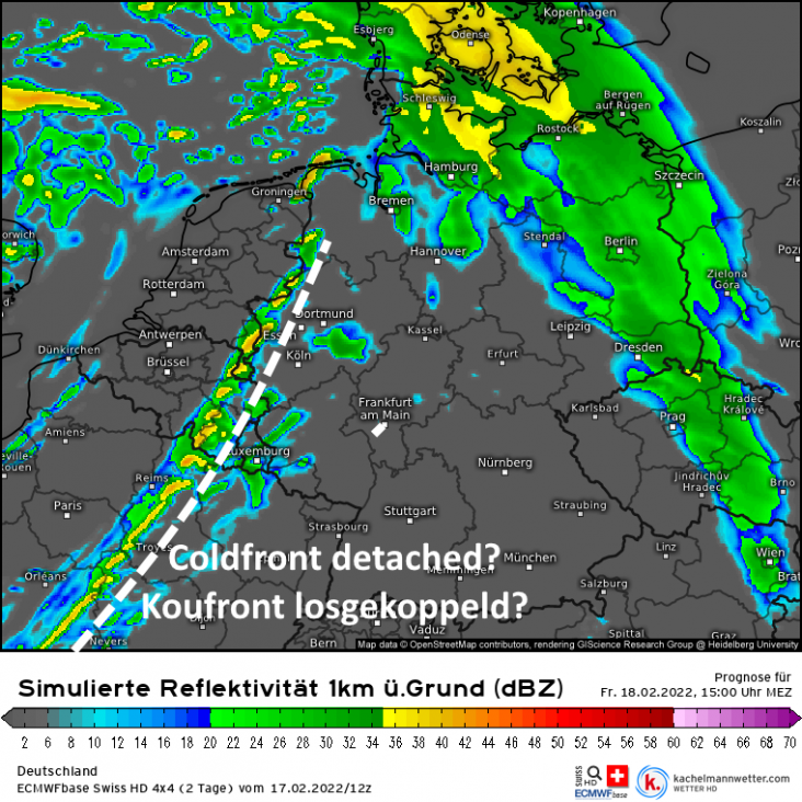 Opvallend is het activeren van de neerslag vanavond voor het warmtefront uit en in de warme sector (op nadering van het koufront), vooral in het noorden en oosten wordt de neerslag buiig van karakter, waarbij de organisatiegraad groot is. Het lijkt op een overlap van WA-0maximum met het zuidelijk deel van een PVA-maximum. Na koufrontpassage vooral in het (noord)oosten buien onder de linkeruitgang. Onder de rechter-uitgang is de activiteit minder. Donderdag in het oosten nog een enkele bui. Op het warmtefront van Eunice lichte tot matige regen.
