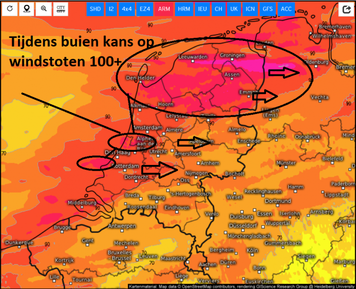 Boven model harmonie toont vooral gedetaileerd de windstoten tijdens buien, dit noemt men convectieve windstoten. Daaromheen zie je de reguliere windstoten. De zwaarste windstoten zijn dus echt op de buien, en die kunnen in heel het land wel plaatsvinden. Op deze kaart zie je slechts de run van vandaag. Die buien kunnen over een groot deel wel vallen maar heel lokaal dus, en daarmee ook die windstoten. Accent is toch wel het noorden.