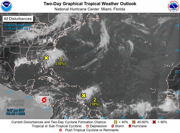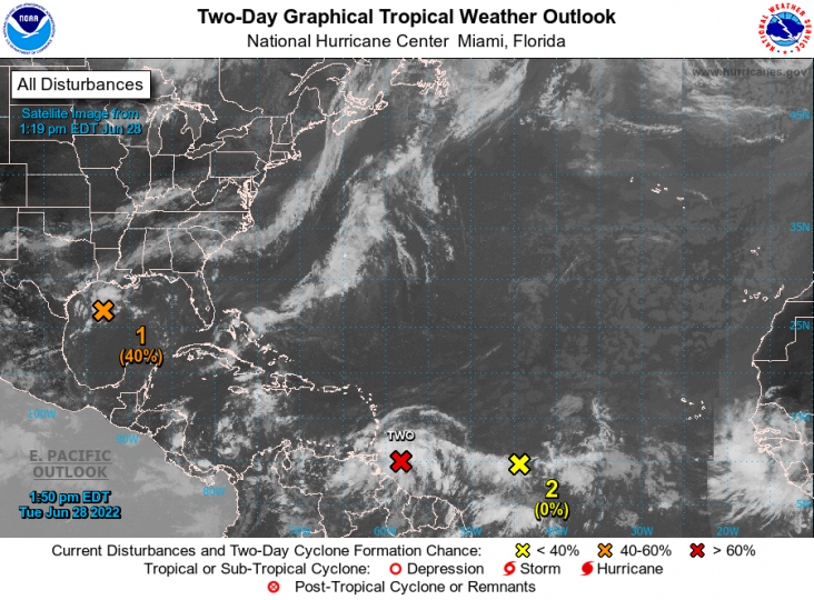 1) Op de Golf van Mexico bevindt zich een gecentreerd lagedrukgebied die regen- en onweersbuien blijft produceren. Het is de verwachting dat het systeem zich langzaam wat meer naar het (zuid)westen zal verplaatsen richting de kust van Texas. De verwachting is dat het misschien nog iets verder ontwikkeld naar een tropische depressie, maar de kans is klein (0 – 40%).