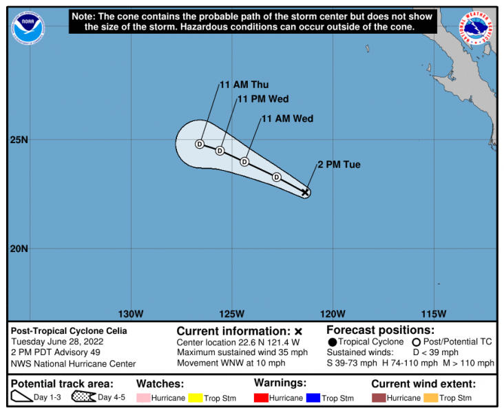 Enkele honderden kilometers ten (zuid)westen van het schiereiland Baja (California, VS) ligt de tropische depressie genaamd Celia. Het systeem heeft windstoten tot 60 km/h en duidelijke neerslagfronten. Ondanks de aanwezige voeding door met name vocht is de verwachting dat het systeem de komende 48 uur iets verder uitdiept, maar nog wel een depressie zal blijven.