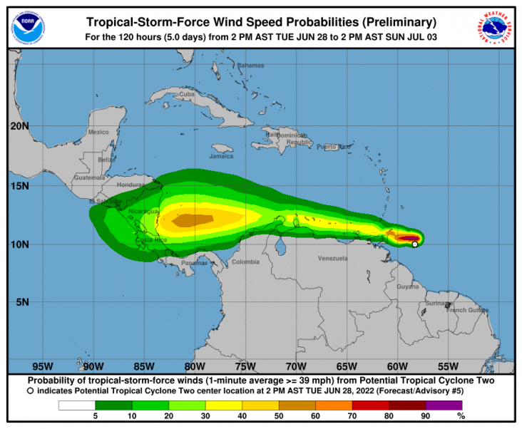 2) Ten oosten van de Bovenwindse/ABC eilanden bevindt zich een tropische cycloon (genaamd TWO op de kaart). De kans is vrij groot dat dit systeem zich in de komende 48 uur tot 5 dagen nog iets verder ontwikkeld (70 – 90% kans) voordat het via het noorden van Venezuela en Colombia naar de Stille Oceaan beweegt. Het windveld reikt tot windstoten van 80 km/u of meer. De verwachting is dat het systeem de ABC eilanden uiteindelijk later deze week heeft gepasseerd.