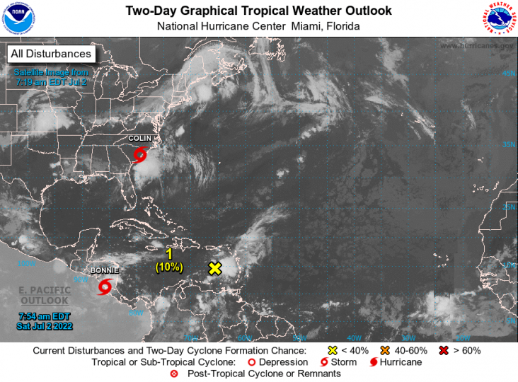 Voor de kust van North and South Carolina (VS) is tropische storm Colin geboren. Naast storm Bonnie zijn dit de twee actieve stormen in de Atlantische oceaan. Beide stormen produceren windstoten van meer dan 80 km/u en produceren daarnaast veel neerslag. Storm Bonnie passeert as we speak over Nicaragua en Costa Rica, terwijl Colin via de kust van North and South Carolina richting het (noord)oosten trekt. De verwachting is dat Colin een tropische storm blijft. Bonnie daarentegen, kan nog aansterken tot een Categorie 1 orkaan wanneer het de voedingsbodem van de Stille Oceaan bereikt.