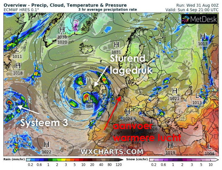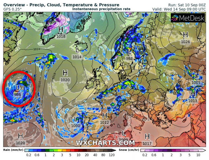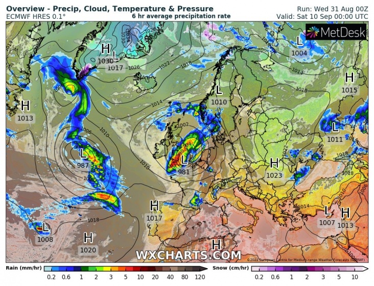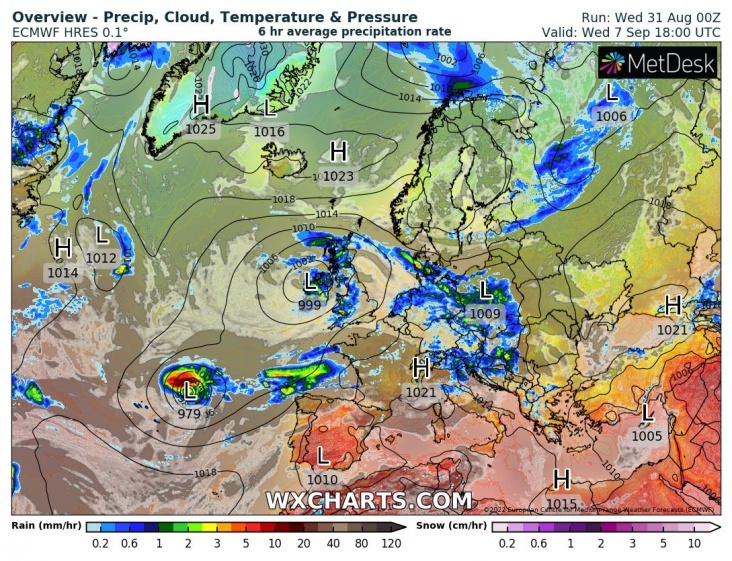 Anders dan GFS stuurt ECMWF het systeem voorbij aan Spanje en Portugal Het Kanaal in. Daarbij blijft het een stevig systeem en zou het misschien een eerste storm van de herfst van dit jaar kunnen betekenen: