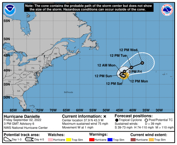 Systeem 3 (zie het vorige bericht) is vandaag uitgegroeid tot een orkaan van de 1e categorie. De orkaan heeft daarbij de naam Danielle gekregen. De orkaan is de eerste Atlantische orkaan van 2022. De verwachting is dat het systeem verder ontwikkeld tot een orkaan van de 2e categorie, waarna het oostelijk afbuigt richting Noord-West Europa.