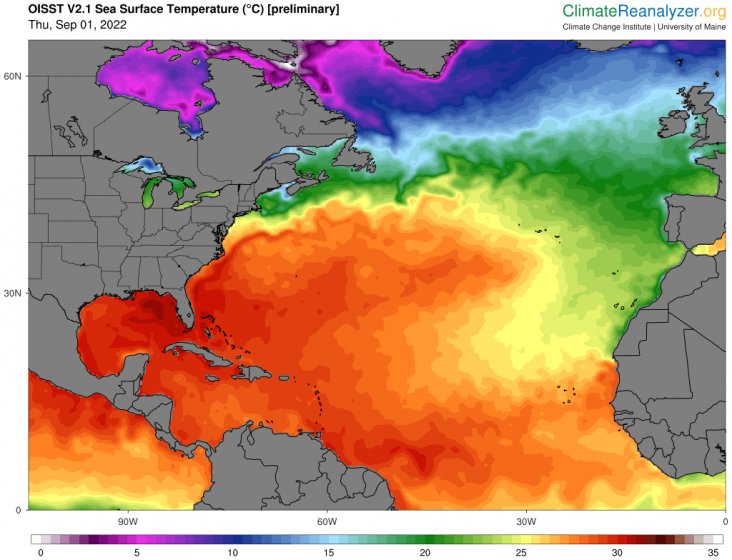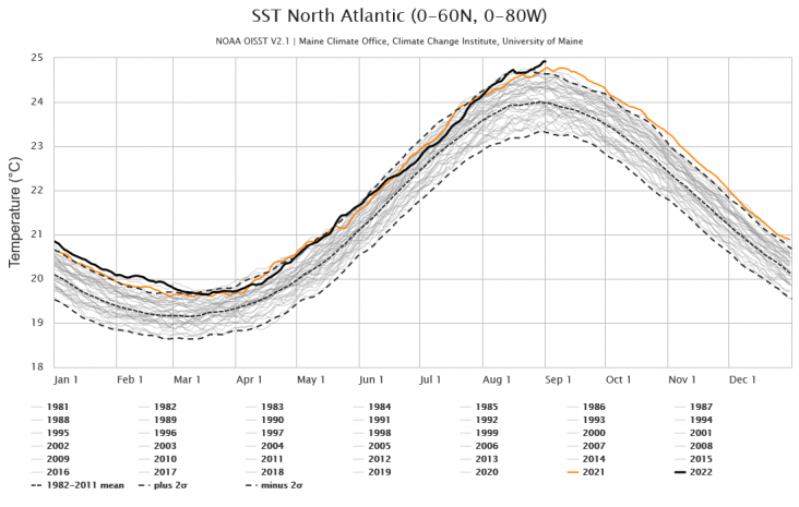 De Atlantische Oceaan is momenteel warmer dan normaal. Vandaag werd er een temperatuur van 24.9 graden Celsius gemeten. Dat is ruim 1.5 graden warmer dan 40 jaar geleden, toen de metingen begonnen.Met deze temperaturen biedt het een ideale broedplaats voor nieuwe stormen en orkanen om zich te vormen. Die, afhankelijk van waar ze vormen, ook het weer hier in Nederland kunnen beïnvloeden. Ik ben benieuwd wat er in dit seizoen nog gaat komen!