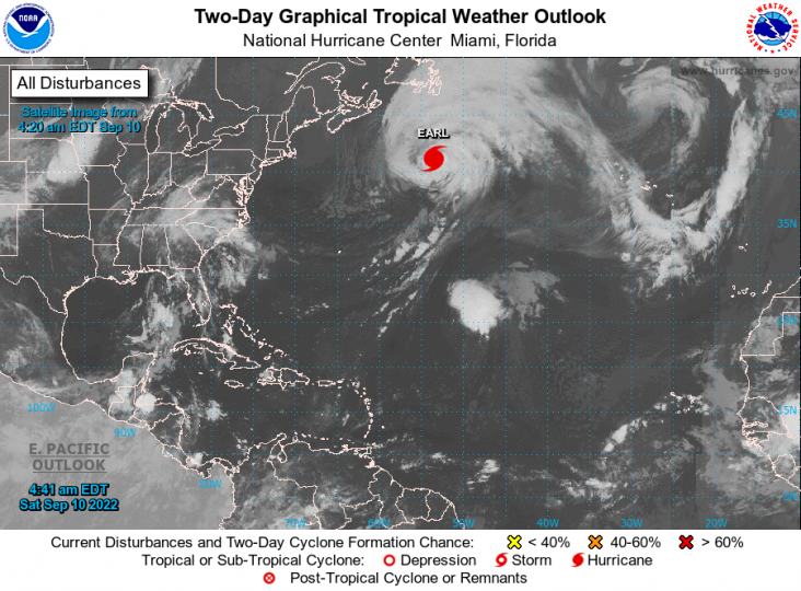 Deze week is orkaan Earl geboren. Deze orkaan is de tweede orkaan van het seizoen 2022. Het systeem bevindt zich nu op de Noordelijke Atlantische Oceaan en brengt windstoten van +200 km/u voort. Als gevolg van deze windstoten veroorzaakt het hoge golven in de omgeving. Deze golven zullen voor hoog water leiden aan de noordoostkust van Noord-Amerika.