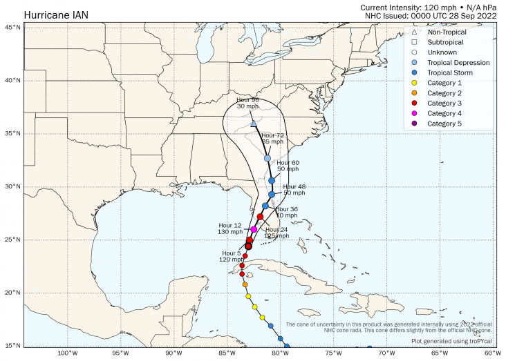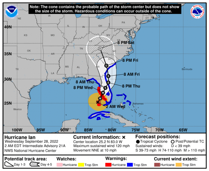 De verwachting is dat Ian nog net zal aansterken tot Categorie 4 voordat deze het vaste land van Florida bereikt. Windstoten kunnen daarbij oplopen tot meer dan 200 km/u. Nadat de orkaan het vaste land heeft bereikt, zal deze in kracht afnemen tot een tropische storm en uiteindelijk als depressie verder het vaste land van de Verenigde Staten intrekken.