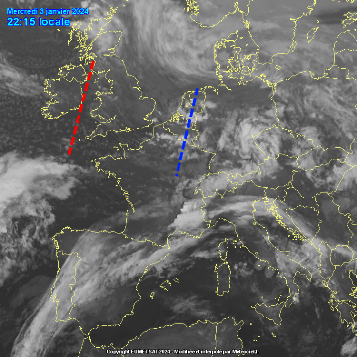 Des te witter, des te hoger de wolk. Donkerste kleur = geen wolken. Rond de hoogtetrog zijn de wolken hoger en de buien zwaarder. Bij de hoogterug zijn er juist amper buien en wolken.