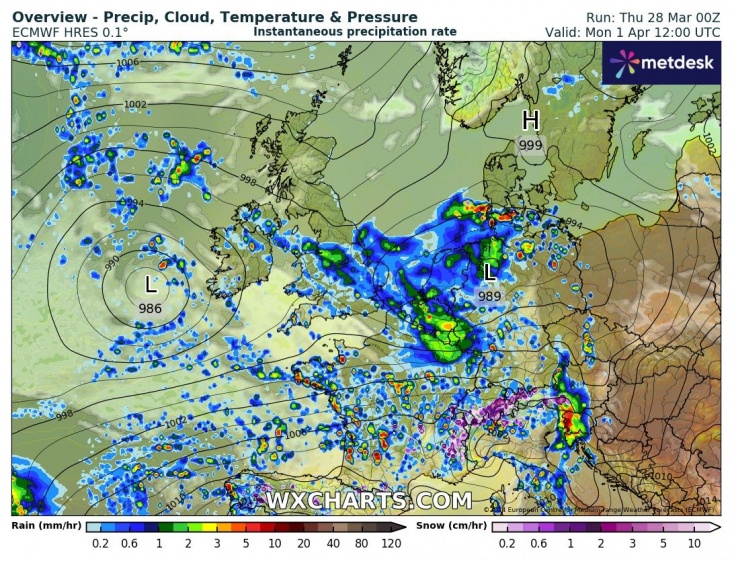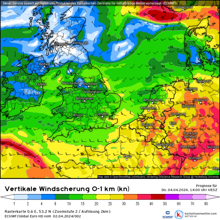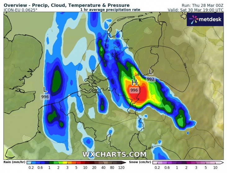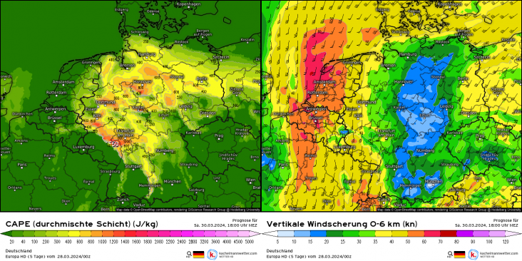 Het warmtefront ligt in de huidige modellen over het westen van Nederland, vanuit het zuiden nadert het lagedrukgebied. Boven Duitsland is het 20 tot 25 graden (het is pas eind maart!). Een diepe zuidelijke stroming brengt warme en vochtige lucht onze kant op, samen met een vleugje saharazand. De meest onstabiele lucht ligt boven Duitsland. Op het moment dat het koufront boven het grensgebied van Frankrijk-Duitsland (Elzas) op de instabiele lucht botst kunnen onweersbuien ontstaan. Ik verwacht voor maartse begrippen al wel vrij forse buien boven Duitsland. Met een hoge organisatiegraad kan het zich oplijnen en zijn randverschijnselen zoals wolkenstructuren (shelf?) mogelijk.