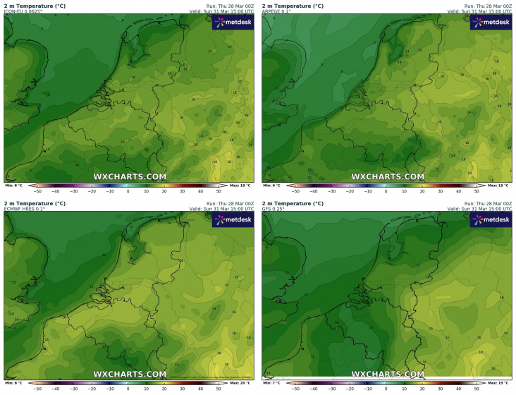 Hierdoor blijft het westen mogelijk permanent aan de koude en toch vrij regenachtige zijde, terwijl het oosten tijdelijk aan de warme zijde komt. Zeker met een lagedrukgebied dat nu pas meer richting de namiddag of avond lijkt over te trekken kan het 's middags nog goed opwarmen langs de oostgrens. 15 tot 19 graden is zeker mogelijk.