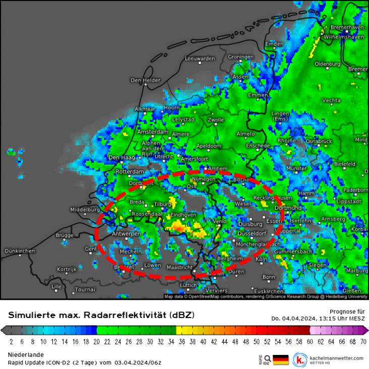 Boven het Rührgebied zijn de eerste buien ontstaan. De convergentielijn (rood) beweegt richting het noordoosten, naar het aandachtsgebied (in cirkel). Daar verwacht ik het de eerste bui, die kan fel zijn met hagel en eventueel windstoten.