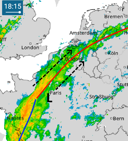 De zware buien ontstaan in de beginfase boven Oost-Frankrijk, vlakbij de grens met Zwitserland. Vervolgens trekken de buien verder noord-noordoostwaarts. Uiteindelijk komen de buien ergens tussen Hamburg en Berlijn uit.