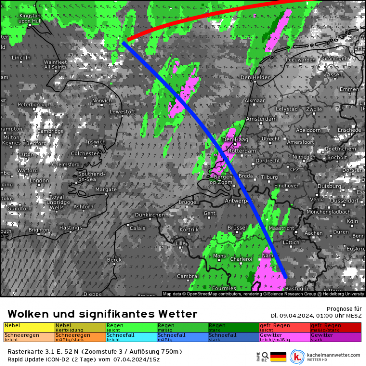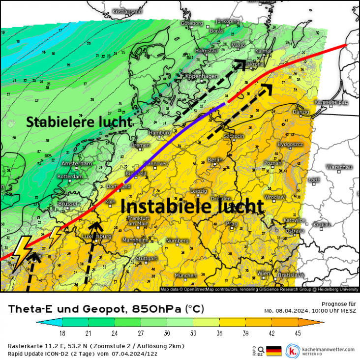 Direct achter het warmtefront vanuit het zuiden stroomt de vochtige en warme (instabiele) lucht naar de Benelux toe. Op dit warmtefront kan de toename in instabiliteit al direct leiden tot een paar ingebedde buien, mogelijk met wat onweer.