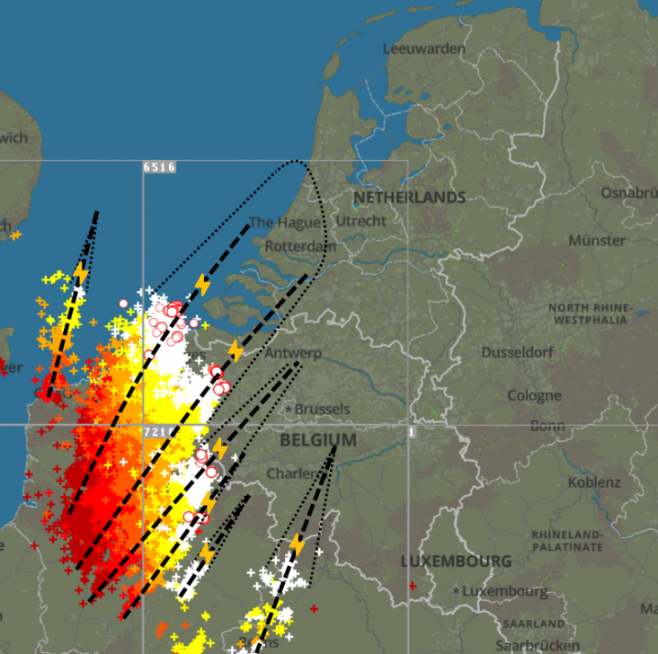 Het meest actieve onweer, aan de noordzijde van het complex, koerst af op Vlissingen. Gezien het vallen van de nacht zal het de vraag zijn of het onweer bijvoorbeeld Rotterdam gaat bereiken of niet. Ook de zuidelijke deel van het complex is actief, daar is het de vraag welke onweersactiviteit er nog over is tegen de tijd dat het Brussel bereikt.
