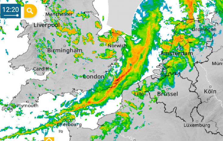 Op dit moment snelle weeromslag. Op het occlusiefront dat vóór het koufront uit trekt komt plaatselijk ook al een beetje onweer voor (Haarlem). Op het koufront zelf ook onweer. Het name door zware windstoten kan het kortdurend spoken op het front.