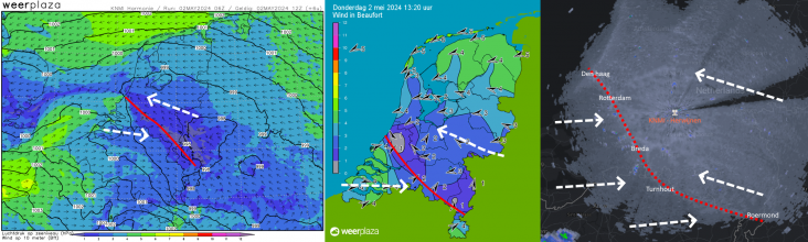 De zone ziet eruit als een lijn, in onderstaande kaarten heb ik de convergentiezone met rood aangegeven. Links zie je de lijn op basis van het harmoniemodel, in het midden zie je de lijn op basis van de windmetingen, en rechts op basis van reflectie op de neerslagradar (stof en insecten die daar met de stijgende lucht verder omhoog worden geblazen zijn heel zwakjes te zien op de radarbeelden, voor de Buienradar worden deze verstoringen eruit gefilterd).