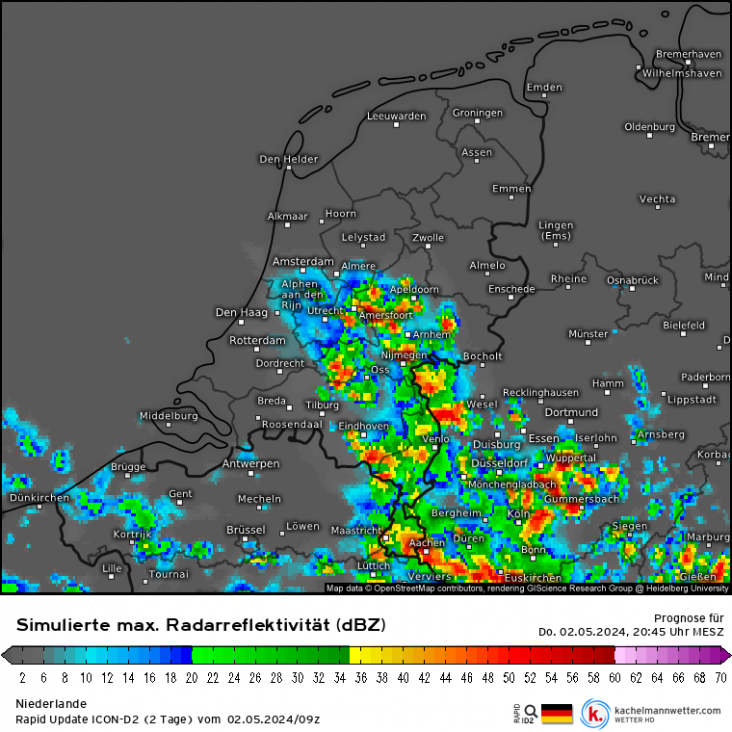 Aandachtspunt is de zware convectie die vooral ten zuidoosten van ons land zal optreden, UWC0 berekent dit zoals gebruikelijk wat realistischer. Mogelijk krijgt ook Limburg een deel van deze zware convectie mee, met in Zuid-Limburg mogelijk wateroverlast. Er is nog wel wat onzekerheid of de zware buien Limburg zullen treffen, de afgelopen runs afgelopen runs hebben de neiging om alles steeds een tikkeltje oostelijker te laten uitkomen.