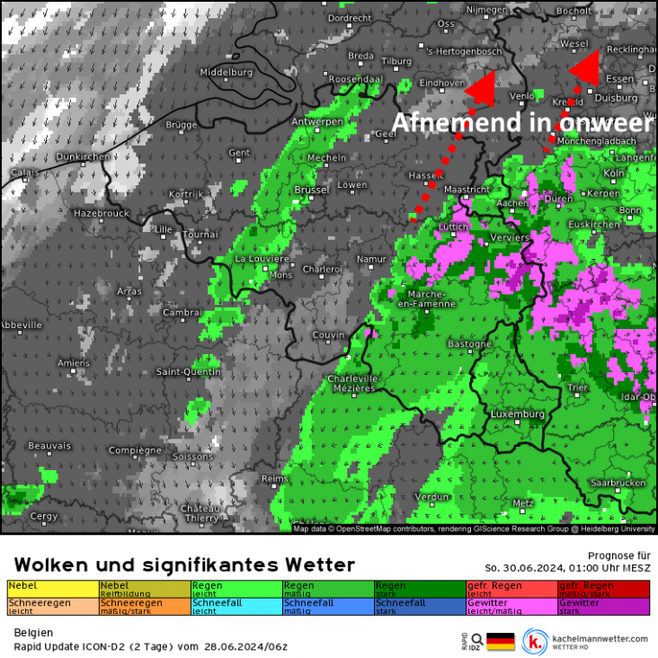 Boven de Ardennen kunnen nog een paar onweersbuien ontstaan, deze zullen duidelijk een maatje kleiner zijn dan die boven Frankrijk&Duitsland. Tegen de tijd dat deze buien bij Limburg aankomen, worden de omstandigheden voor deze buien ongunstig. De buien zullen boven Nederland dus hun onweer grotendeels verliezen. Met een noordnoordoostelijke stroming gaan de buien morgenavond van Limburg richting de Achterhoek. In de rest van de Benelux blijft het waarschijnlijk droog.
