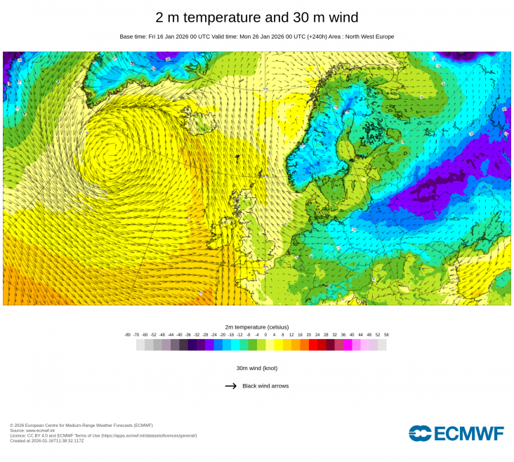 Scandihoog die de huidige stroming in stand houdt. De storing inclusief regengebied die vanuit het zuidwesten vandaag over NL trekt zal in de nacht en ochtend in het noorden overgaan in (natte) sneeuw. Groningen kan zo'n 5 tot 10 cm verwachten.